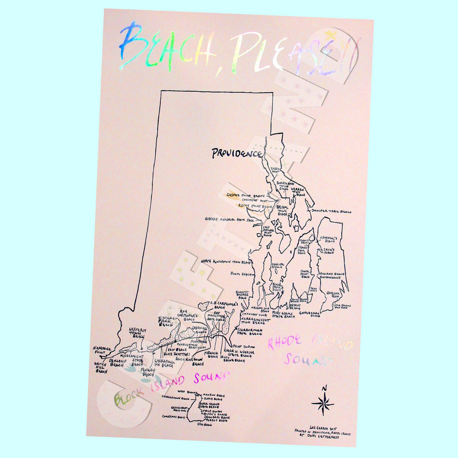 Celebrate your love for sandy shores with the "Beach Please!" Rhode Island print. Crafted in Providence by Dan Wood and Lois Harada, this vibrant 11x17 letterpress creation combines deep navy-blue ink with shimmering holographic foil to capture the spirit of Rhody’s iconic beaches. Hang it where sunlight dances off the foil, bringing waves of summer fun indoors all year long. Perfect for beach lovers, this playful print adds a splash of coastal charm and endless vacation vibes to your home décor. Let it remind you where the best beach days happen—Rhode Island style!