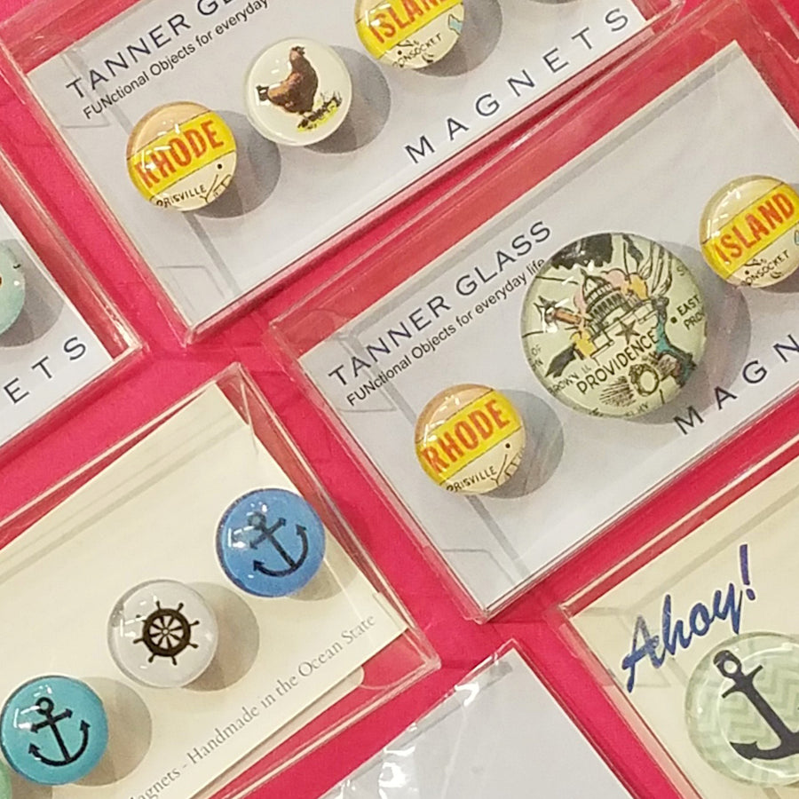 Magnets made by Tanner Glass bring a touch of Rhode Island charm to any space! These durable little gems are the perfect gift for someone missing home or a fun way to celebrate your New England roots. Available in three size options—1/2 inch, 3/4 inch, or 1 inch in diameter depending on the design—each magnet is crafted with care and personality. Choose from six distinctive designs that capture the essence of Rhode Island: the RI Map collection features three unique regional variations, the RI Name set showcases two stylish interpretations, and the RI Iconography series offers four designs packed with local symbols and character. Whether you're decorating your fridge, office, or locker, these magnets add instant personality while staying put thanks to their strong magnetic backing. Perfect for dorm rooms, new apartments, or as a thoughtful housewarming present for anyone with a soft spot for the Ocean State. Mix and match designs to create your own custom collection!